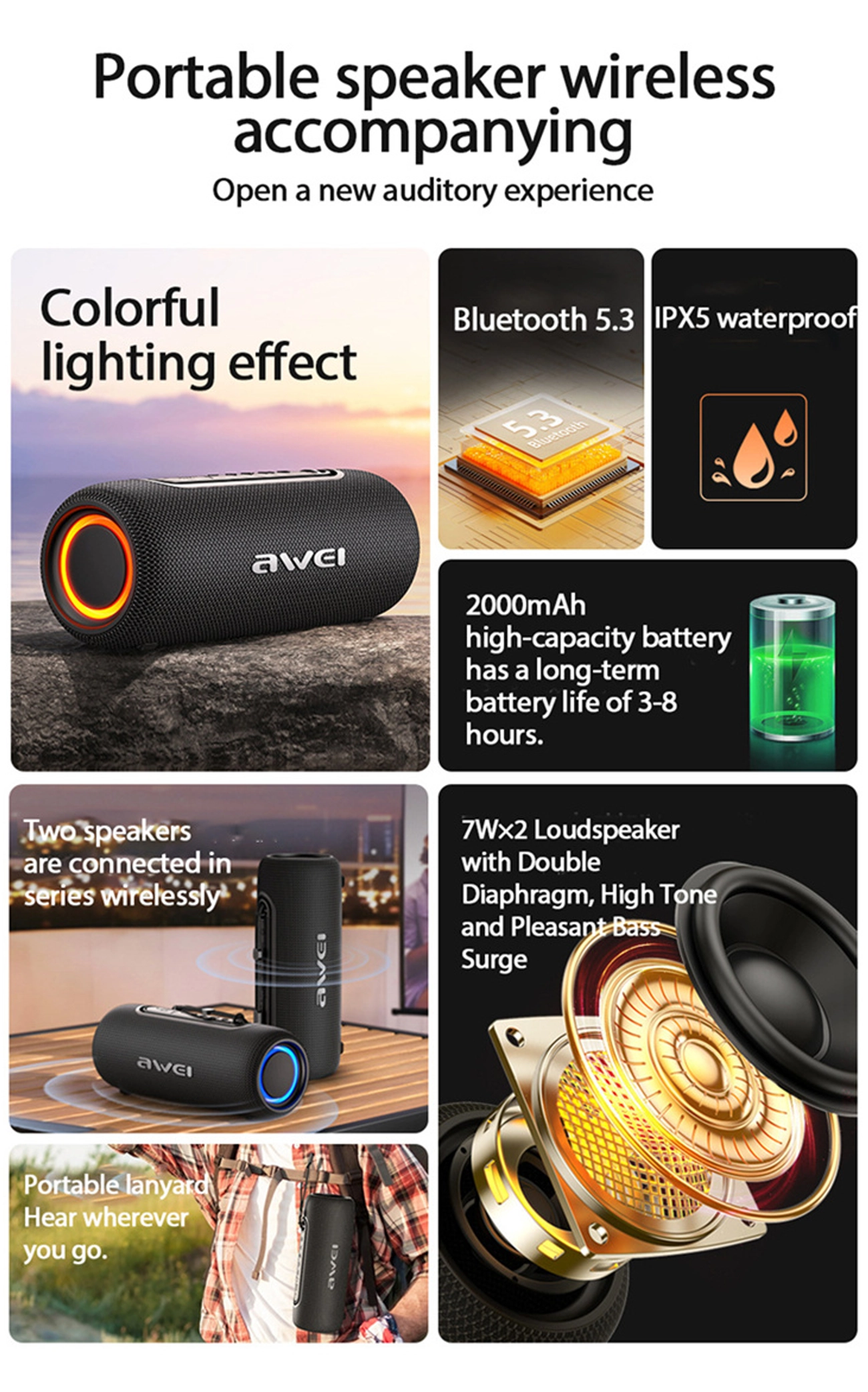 RGB Light: AWEI KA8 is equipped with an RGB light feature that syncs with the rhythm of your music, setting the perfect mood for any occasion.