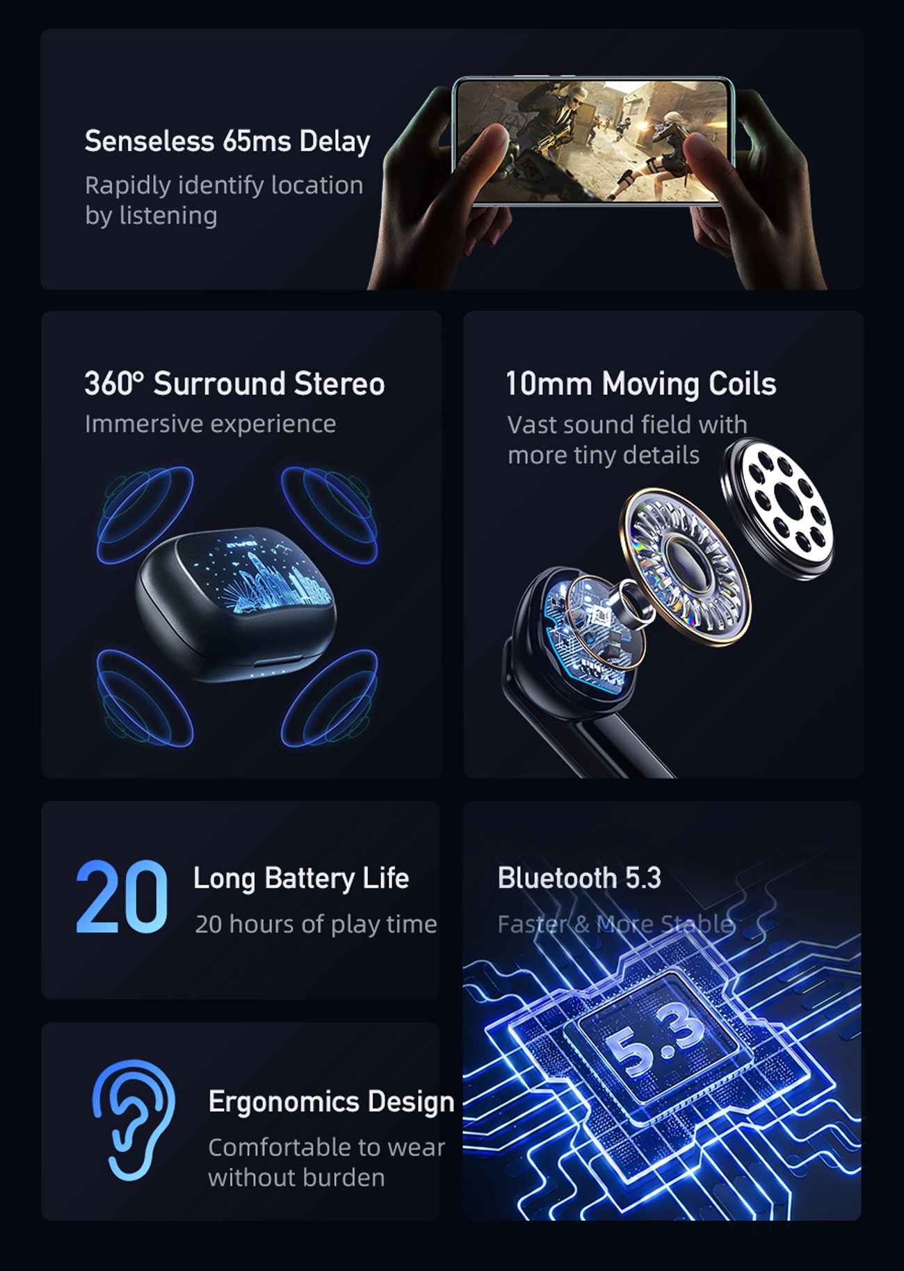 Moreover, the 300mAh battery in the charging case, reinforced with a protective plate, ensures long-lasting performance, while the individual earbuds’ 40mAh batteries deliver reliable power. With a sensitivity of 104 3dB, an impedance of 16, and a broad frequency response range of 20 Hz to 20 KHz, these earbuds deliver unparalleled audio quality. Designed for comfort, they provide an immersive listening experience that enhances calls, podcasts, and music.