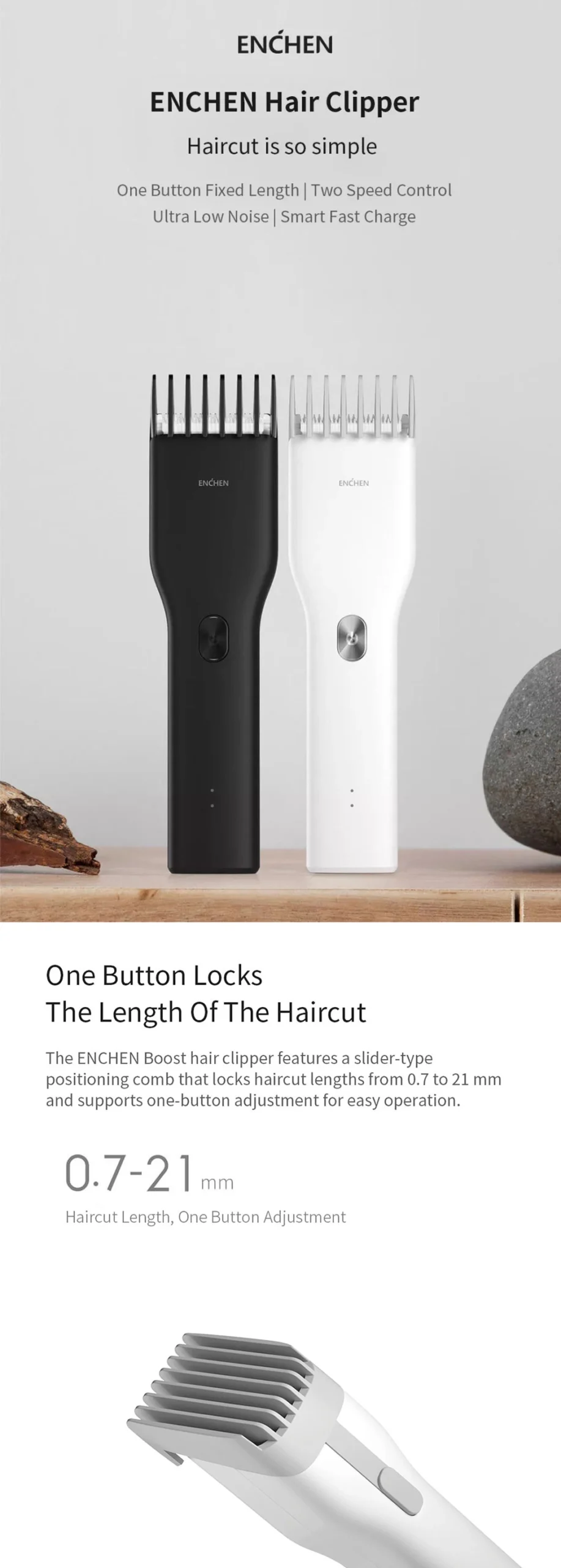 – 3-21mm Total 7 levels on device Haircut length one button adjustment Nano ceramic cutter head Ultra low noise smooth speed shear